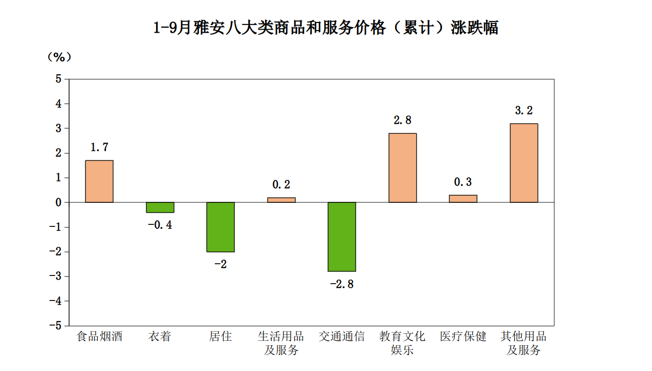 1-9月,八大类商品和服务价格累计呈现“五涨三降”态势。其中,食品烟酒类上涨1.7%,涨幅较上月缩小0.7个百分点;生活用品及服务上涨0.2%,涨幅较上月缩小0.1个百分点;教育文化和娱乐类上涨2.8%,涨幅较上月缩小0.3个百分点;医疗保健类上涨0.3%,涨幅与上月持平;其他用品和服务上涨3.2%,涨幅较上月扩大0.3个百分点;衣着类较同期下降0.4%,降幅与上月持平;居住类下降2%,降幅较上月缩小0.3个百分点;交通和通信类下降2.8%,降幅较上月缩小0.3个百分点。
